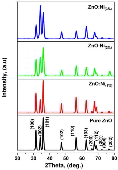 Figure 3 illustrates the X-ray diffraction patterns for the pure and Ni-doped nanostructures (1%, 2%, and 3%). The distinct peaks in both the pure and doped specimens correspond to the indices (100), (002), (101), (102), (110), (103), (200), (112), (201), (004), and (202), which align well with JCPDS card number 89-0510 [42]. The detected prominent peaks confirm the presence of a hexagonal wurtzite structure in the ZnO, which was characterized by the P63mc space group [42]. Additionally, the diffraction patterns revealed no secondary phase due to Ni doping. This absence of a secondary phase might be attributed to the replacement of Zn ions by doped Ni ions, which, in turn, is likely due to the similar ionic radii of Ni2+ (0.069 nm) and the substituted Zn2+ ions (0.074 nm).