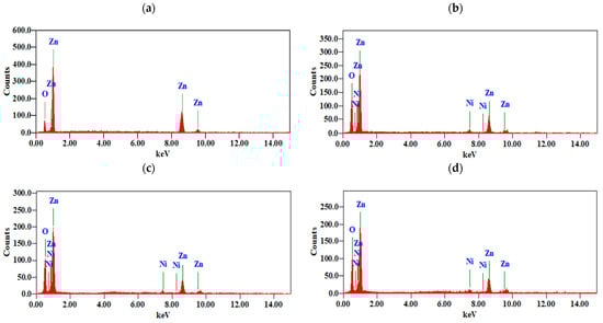 (a–d). Elemental analysis of (a) pure ZnO, (b) ZnO: Ni(1%), (c) ZnO: Ni(2%), and (d) ZnO: Ni(3%).