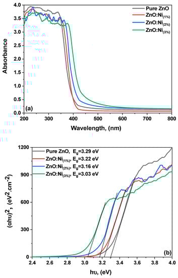 Figure 6a displays the UV–Vis absorbance spectra of the pure ZnO and Ni-doped ZnO nanostructures, with Ni-doping concentrations of 1%, 2%, and 3%, as a function of the light wavelength in the range of 200–800 nm. In the pure ZnO samples, a prominent absorption edge at 380 nm can be observed in the UV–Vis spectrum. As the Ni-doping concentration increases, the absorption edge shifts towards a higher wavelength region, leading to a redshift and a band-narrowing effect [50]. In the UV region, the absorption rate of the ZnO is relatively large, namely, in the range of 200−380 nm, while the absorption rate starts to increase in the range of 380 nm or more for the doped samples.