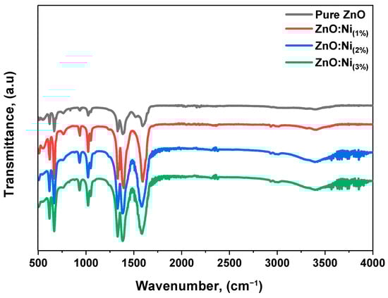 The wurtzite structures of the pure and Ni-doped ZnO nanostructures were investigated using Fourier transform infrared (FTIR) spectroscopy. The analysis was carried out in the range of 500 cm−1 to 4000 cm−1, and the spectra for the pure and doped samples are illustrated in Figure 7. The M-O stretching mode, which is associated with the functional groups, was assigned to the spectral region between 500 and 600 cm−1. Furthermore, the peaks at around 500 cm−1 were attributed to the E2 (L.O.) mode, which is typical of ZnO’s wurtzite structure [55]. The asymmetric and symmetric stretching vibration modes of C=O were observed in the range of 1300 cm−1 to 1600 cm−1 [53]. The peak at 1500 cm−1 was also ascribed to the stretching modes of vibrations in symmetric and asymmetric C=O bonds and Zn(OH)2 bending vibrations. The weak band observed near 800 cm−1 was attributed to the metal–oxygen vibration frequency and the result of changes in the microstructural characteristics induced by adding Ni to the Zn-O lattice [53]. Furthermore, the Ni-doping level varied from 1% to 3%, which may have affected the vibrational modes of the samples.