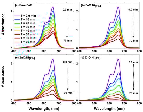 (a–d) Spectra concerning absorption of MB dye by pure and Ni-doped ZnO nanostructures.