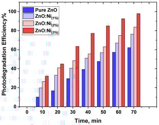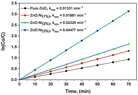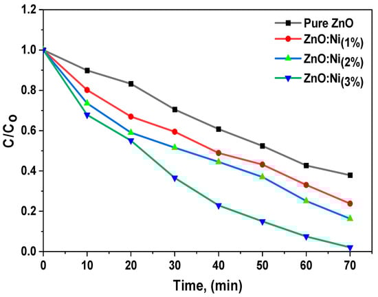 The decrease in the absorption spectra of MB over time indicates significant photocatalytic activity, which is a result of the creation of hydroxyl radicals due to electron pair migration to the surface. Adding Ni to ZnO catalysts with reduced band gaps improved the efficacy of decomposing organic dyes. This improvement is due to the increased surface area, oxygen vacancies, and the generation and spatial separation of electron–hole pairs. The researchers employed the photocatalytic kinetics method to accurately measure the dye degradation rate. Figure 9 displays the change in the ratio of the dye concentration () to its initial concentration () over time. By tracking this ratio, the researchers could determine the rate at which the dye decomposes.
