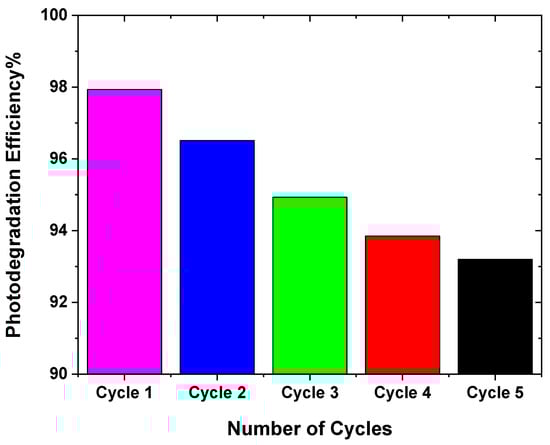 The efficacy of photodegradation in decomposing dyes was investigated using Equation (2), and the results are presented graphically in Figure 12. The dye mixture’s adsorption values upon exposure to blue laser illumination for five cycles, with agitation applied for 60 min, were noted. It was observed that the ZnO:Ni(3%) photocatalyst exhibited consistent and robust performance, maintaining approximately 93.2% photodegradation after five consecutive cycles. The material’s potential application in water purification processes was sparked by this observation. Additionally, it was noted that the photocatalyst retained its activity after multiple cycles, which is a critical consideration for practical utilization in wastewater treatment.