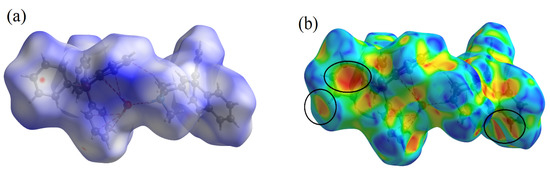 In the CBP-TPB complex, the dnorm value ranged from −0.0916–1.7427 Å, the shape index ranged from −1.00 to 1.00 Å, and the curvedness ranged from −4.00 to 4.00 Å, as shown in Supplementary Materials, Figure S1. The dnorm surface has brick-red circular patches, representing close interaction with surrounding molecules; a hydrogen connection between O–H and N–H was discovered despite the fact that the intermolecular H–H, N–H, and C–H interactions were defined by blue and white patches. Because the O atom has a greater electronegativity (3.34) than the N atom (3.04), it is possible that the oxygen atom had the most influence on the electron density on the H atom. One of the key characteristics of Hirshfeld analysis is the shape index, which identifies complementarity between molecules in crystal packing [38]. Patches of varied colors on a “shape index” surface exhibiting intermolecular complementarity zones are shown in Figure 2b. The pi-stacked molecules in the concave section are represented by red highlighted patches. The ring structure of the molecule inside the crystal surface is depicted by the convex area in blue.