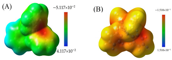 The molecular electrostatic potential (MESP) is an essential aspect to evaluate when analyzing molecular interactions within a complex, such as the CBP-TPB system. MESP provides insights into the electrostatic properties of the molecules, which in turn helps to elucidate the interaction mechanisms and behavior of the complex. In contrast, Figure 6A,B illustrate the MESP for the neutral and anionic TPB molecules, respectively. In both cases, a red region is observed on the phenyl ring, with MESP values of −0.155 a.u. for the anion and −5.117 × 10−2 a.u. for the neutral molecule. The red region signifies electron-rich areas, or “shells”, which can potentially interact with the electron-poor regions in CBP.