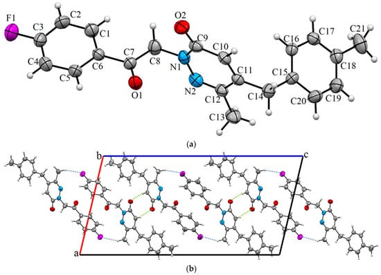 Figure 1a shows the asymmetric unit of FOMMP and Table 1 summarizes the crystal data and structure refinement. There is one independent molecule in the asymmetric unit. In this crystal, FOMMP is not planar, the C1–C6 fluorophenyl ring is inclined to the pyridazin ring by 87.0(2)°, while the methylbenzyl and pyridazin rings are twisted for each other, making a dihedral angle of 89.8(2)°. The molecular structure is stabilized by the intermolecular C10–H10···O2 and C13–H13B···F1 hydrogen bonds (Figure 1b and Table 2). In the crystal, molecules are linked by a pair of C13–H13B···F1 hydrogen bonds forming inversion dimers. The dimers are linked by C10–H10···O2 hydrogen bonds forming chains along the b-axis direction. In the molecule, the C7–O1 and C9–O2 bond distances are essentially equivalent, i.e., 1.210(7) Å and 1.238(7) Å, respectively. These bond lengths are typical of double bonds.