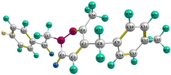 Figure 2 shows the optimized structure and the atom numbering of the title compound. The structure used in all subsequent analyses takes the optimized structure of this molecule into account. Let the ring systems C9–C10–C11–C12–C13–C14 and C20–C21–C22–C23–C24–C25 be designated as ring I and II, respectively. C–C bond lengths in benzene rings were observed to be 1.42 Å for ring I and in ring II. The presence of fluorine in the carbon skeleton of ring I caused a slight deviation in the C–C bond distance from the regular expected value, which is 1.393 ± 0.02 Å [,,]. H–C–H angles varied between 108.8–110.8°. Angle C1–N6–C17 = 119.2°, which falls in an expected range of 119° [] such that the asymmetry observed was due to interactions between C and N–H groups. Slight aberrations from the literature values can be attributed to the variations due to the least-square refinements and inverse overlap [,].