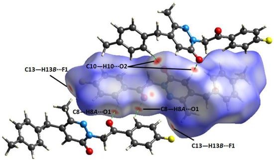 In this study, the contributions of different intermolecular interactions to the crystal structure were investigated using Hirshfeld surface (HS) analysis. Figure 4 illustrates the Hirshfeld surface of FOMMP with mapped dnorm. The red spots on the HS indicate the intercontacts included in the intermolecular interactions [,,]. Areas where neighboring atoms are too far apart to interact with each other are indicated by blue fields.