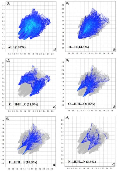 The surfaces of 3D dnorm were plotted over a fixed color scale of −0.1843 (red) to 1.4882 (blue) with a standard (high) surface resolution. In Figure 4, the red circular collapsing on the dnorm surface of the FOMMP structure represents the C–H∙∙∙O and C–H∙∙∙F intermolecular interactions. The 2D fingerprint of the total contacts in HS is illustrated in Figure 5. The major contributions to the total HS are H∙∙∙H interactions with 44.3%, which illustrates the 2D fingerprint of the (di, de) points related with H atoms in Figure 5. In Figure 5, two symmetrical wings on the left and right sides (21.9%) are shown on the graph of C∙∙∙H/H∙∙∙C interactions. In addition, there are O∙∙∙H/H∙∙∙O (15%), F∙∙∙H/H∙∙∙F (10.5%), and N∙∙∙H/H∙∙∙N (3.6%) contacts.