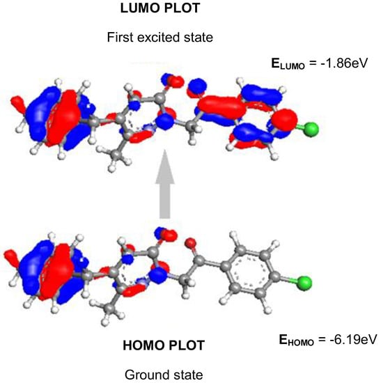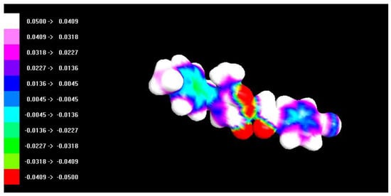 FMO analysis is suitable to attain details on the reactivity and stability associated with the title compound [,]. HOMO, LUMO energies, and the energy gap were −6.19, −1.863, and 4.327 eV, respectively, and are represented in Figure 6. The calculated energy values of FOMMP are seen in Table 3. A considerably low energy gap suggests chemical reactivity associated with FOMMP []. A hardness η of 2.164 eV defines the degree of resistance to the distortion in electronic configuration [,] in the molecule while an electronegativity χ calculated to be 4.027 eV explicates the affinity of the selected molecule towards electrons []. Compared with the available literature [,], it can, thus, be concluded that the η value in this molecule demonstrates that it is not a very hard molecule. This, in turn, is associated with greater reactivity due to an amplified sensitivity towards the transfer of charges []. In addition, the electrophilicity index ω (3.747 eV) falls in a region that suggests the title molecule is biologically active []. These reactivity and bioactivity descriptors behave as a precursor in scrutinizing the title compound further for its biological activity in terms of molecular docking.