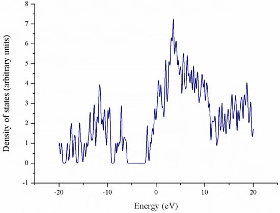 The DOS spectrum as seen in Figure 7 depicts the available states to be occupied by electrons for an energy range of −20 to 20 eV. The maximum number of states available to be occupied by electrons in the positive and negative domains corresponds to ≈11.5 eV and 3.5 eV along the negative and positive axes, respectively.