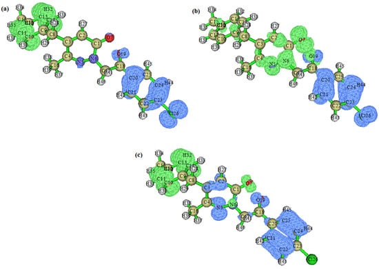 Electron–hole distribution for excited states (a) S1, (b) S2, and (c) S3 of FOMMP (represented as green and blue isosurfaces, respectively).