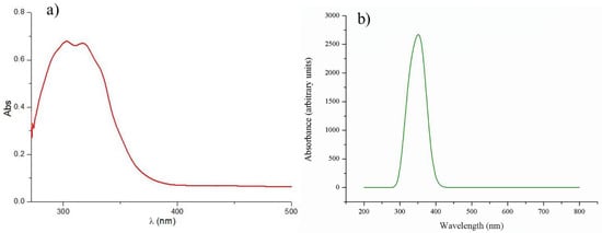 Experimental (a) end simulated (b) UV-Vis absorption spectra of FOMMP.