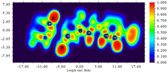 Details about D, S, and the excitation energy of the first three excited states: S1, S2, and S3, are presented in Table 4, while the electron–hole (represented by green–blue, respectively) distribution is represented in Figure 8. The value of Δr, which is the numerical gauge of the electron excitation mode [] in the title molecule, was greater than 2 Å. This suggests that the molecule exhibits long-range excitations corresponding to all three excitation states. From Table 4, it can be seen that the largest value of D and the smallest value of S is for S1, thereby indicating a greater CT length. In all three excited states, the electron and hole distribution observed in terms of the RSMD of the electron and hole values was maximum along the X direction (refer Table 4). The extent of separation between holes and electrons represented by the t-index suggests that, if the ‘t’ value along any one direction is greater than zero, then sufficient spatial separation is present between holes and electrons []. In this molecule, the ‘t’ index was detected to be greater than zero along the X direction, thus indicating a hole–electron spatial separation. This observation was in concurrence with data attained in terms of D and S values. On visualizing the hole–electron spatial separations, all three states can be seen to show significant spatial separation (refer to Figure 7).