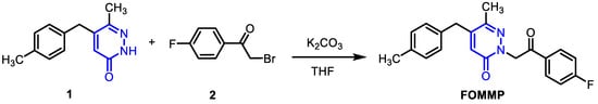 The FOMMP compound was synthesized following the reported procedure [,,,]. To a mixture of pyridazinone (1) (3 mmol) in 20 mL of THF, potassium carbonate (9 mmol) and 10% of tetrabutylammonium bromide (TBAB) were added as catalyst. The reaction mixture was refluxed for 1 h. After cooling, 2-bromo-1-(4-fluorophenyl)ethan-1-one (2) (3.2 mmol) was added dropwise and the mixture was refluxed for 6 h. The reaction mixture was filtered, the solvent was removed, and the residue was purified by chromatography on a silica column (Eluent: ethyl acetate/hexane: 5/5) to give the product (FOMMP). Yellow crystals produced the following yield = 67%, mp = 154–156 °C; 1H NMR (300 MHz, CDCl3, δ (ppm)): 1.48 (s, 3H, CH3); 2.19 (s, 3H, CH3); 3.72 (s, 2H, -CH2-), 5.54 (s, 2H, –CH2CO); 6.55 (s, 1H, H-pyridazinone); 7.10-8.25 (m, 8H, H–Ar). 13C NMR (75 MHz, CDCl3) δ, ppm: 19.29; 21.20; 38.34; 57.62; 77.71; 128.61; 128.92; 129.02; 129.61; 129.86; 129.92; 130.50; 133.37; 134.67; 135.74; 137.75; 146.29; 147.52; 161.68, 193.22. MS-ESI+: m/z = 351.2 [M+H]+, 373.0 [M+Na]+.