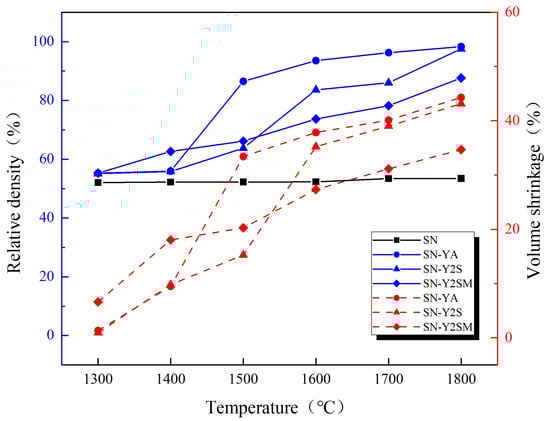 At the 1300 °C stage, there were no significant changes observed in the sintering density and shrinkage rate of the three samples with sintering additives, indicating that the three sintering additives did not create any liquid phase formation at this stage, thus preventing densification. However, with the increase in temperature, the samples enhanced with YA, Y2S, and Y2SM additives exhibited a remarkable increase in shrinkage and densification rate in the temperature ranges of 1400–1500 °C, 1500–1600 °C, and 1300–1400 °C, respectively. The reason for this increase was that the three sintering additives coincided with their liquid phase formation temperatures in the corresponding temperature ranges, namely 1430 °C, 1550 °C, and 1390 °C, respectively. This coincidence produced a large amount of liquid-phase-promoting particle rearrangement, resulting in a rapid increase in shrinkage rate and densification rate. The sample SN-Y2SM was the first to show shrinkage and densification in the temperature range of 1300–1400 °C, but the densification rate and shrinkage rate remained constant throughout the subsequent heating and sintering processes, finally attaining a density of only 87.65%, as shown in Figure 3. The SN-YA experiment also showed rapid sintering shrinkage at 1400–1500 °C, with a final density of 98.29%, slightly higher than that of the SN-Y2S sample that had a liquid phase formation temperature of 1500–1600 °C, giving it a density of 97.56%.