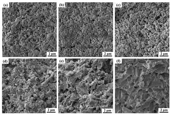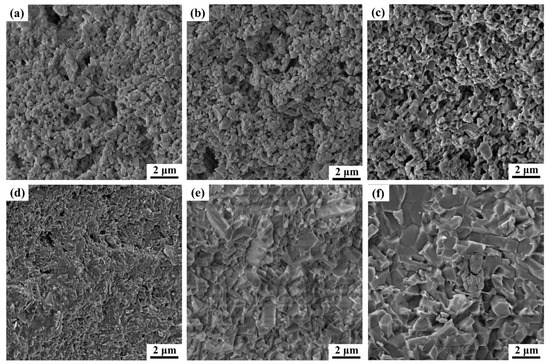 Additionally, elongated β-Si3N4 grains can be observed in Figure 4d, Figure 5d and Figure 6d, indicating that some α-Si3N4 grains that dissolved in the liquid phase have precipitated and nucleated to form β-Si3N4. With the increase in temperature, α- Si3N4 continues to transform into β-Si3N4, and the size of β-Si3N4 grains increases while the porosity gradually decreases. It is noticeable from Figure 4e,f, Figure 5e,f and Figure 6e,f that the size of β-Si3N4 grains progressively increases while the porosity reduces until almost all α-Si3N4 converts into β-Si3N4. The β-Si3N4 grains progressively link with each other to form a skeleton, and the rate of densification slows down. Eventually, the densification process is almost completed at 1800 °C.