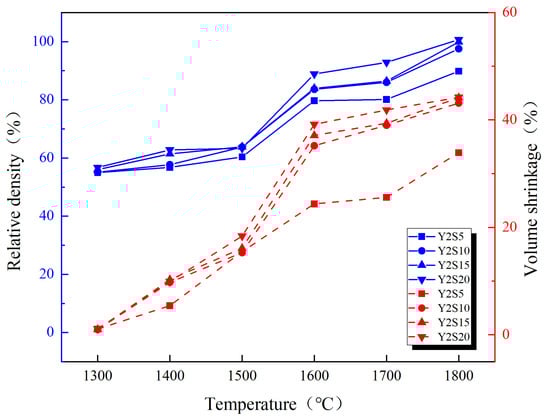 During the initial stage, 1300–1500 °C, the density of the Y2S5, Y2S10, Y2S15, and Y2S20 samples displays slight gains in growth as the temperature increases. This minor increase may stem from the generation of a limited amount of liquid phase, resulting in partial densification of the sample.