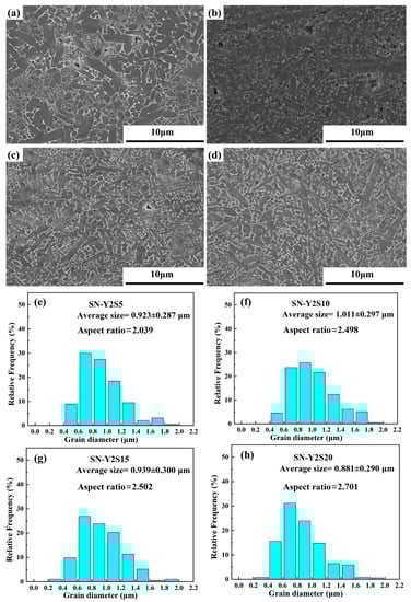 SEM and grain size distribution of Si3N4 ceramic samples after sintering at 1800 °C. (a,e) Sample Y2S5, (b,f) sample Y2S10, (c,g) sample Y2S15, (d,h) sample Y2S20.
