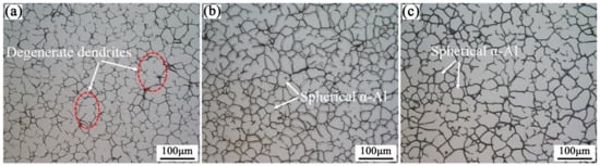 Microstructure of semi-solid slurry of 7075 alloys at different rates of cooling water: (a) 100 L/h; (b) 200 L/h; (c) 300 L/h.