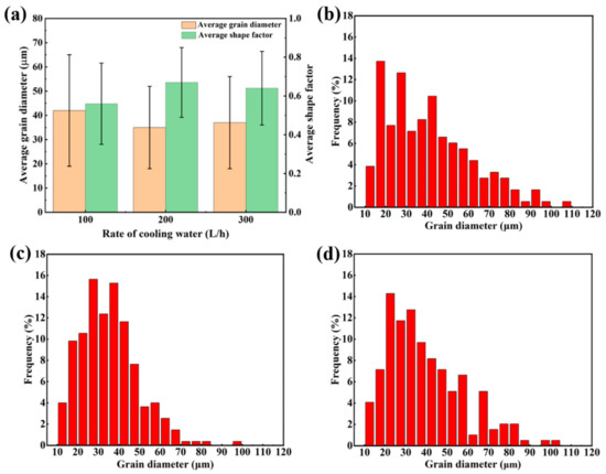 (a) The effects of the rate of cooling water on average grain diameter and shape factor; Relative frequency distribution of the grain size at each rate of cooling water: (b) 100 L/h; (c) 200 L/h; (d) 300 L/h.