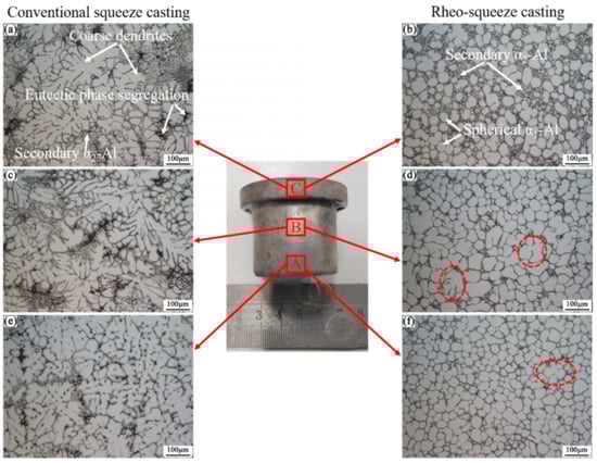 The microstructure of the LSC and Rheo-SC samples can be seen in Figure 8. According to Figure 8, the LSC samples are primarily made up of coarse dendrites, some of which have grains larger than 200 μm, and numerous fine diffuse secondary α2-Al particles created by the liquid phase that was left in the melt and scattered between the primary α-Al. Due to the die temperature (300 °C) being much lower than the melt temperature during the LSC process, there is a significant temperature gradient when the melt is poured into the die. This causes a rapid loss of heat from the melt, followed by the formation of a solidified shell layer with some shrinkage, which causes a barrier to form between the die and the melt, degrading the pertinent contact conditions and impairing the subsequent heat transfer [29]. Additionally, during LSC, substantial intergranular eutectic phase segregation is typically caused by the high casting temperature and quick solidification [30], as shown in the dark positions in Figure 8a,c,e. As can be seen in Figure 8, the dendrite arms at positions B and C of the LSC part are coarser and contain more intergranular eutectic phase segregation than position A. This is because position A is closest to the sprue, and the cooling rate at C is faster compared to position A, resulting in a much faster solidification rate than position A. As a result, the casting’s filling direction causes an increase in the segregation of the intergranular eutectic phase.