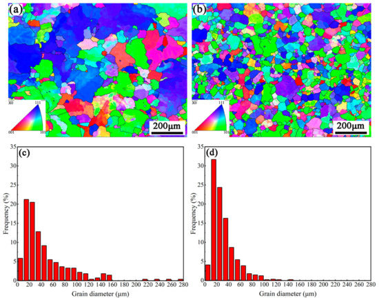 EBSD map and relevant grain size distribution: (a) LSC sample; (b) Rheo-SC sample; (c) Relative frequency distribution of grain diameter in LSC samples; (d) Relative frequency distribution of grain diameter in Rheo-SC samples.