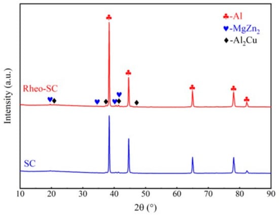 Figure 10 shows the EDS of the intergranular second phase of the Rheo-SC samples. The second phase in the 7075 aluminum alloy is mainly composed of Mg(Al, Cu, Zn)2, Al2Cu, Al2CuMg phase, etc. The microstructure of the Rheo-SC sample has a high percentage of Al atoms in the rod-shaped intergranular second phase (as shown at point 1 in Figure 10) and a low percentage of Zn and Mg atoms, with a possible phase composition of MgZn2. At point 2, the Cu atomic percentage is higher, and the possible phase composition is Al2Cu. The intergranular bright white second phase (position 3) has a high Al to Cu atomic proportion, and the possible phase composition is the Al2Cu phase and Al2CuMg phase. It is clear to see that during the Rheo-SC process of the 7075 aluminum alloy, Cu elements are prone to intergranular segregation [4,35]. The XRD patterns of the 7075 aluminum alloy samples prepared by LSC and Rheo-SC are shown in Figure 11. It is clear that the samples obtained by LSC or Rheo-SC, which are both composed of the α-Al, MgZn2, and Al2Cu phases, have the same phase composition. Lower concentrations are indicated by the MgZn2 and Al2Cu phases’ smaller diffraction peaks.