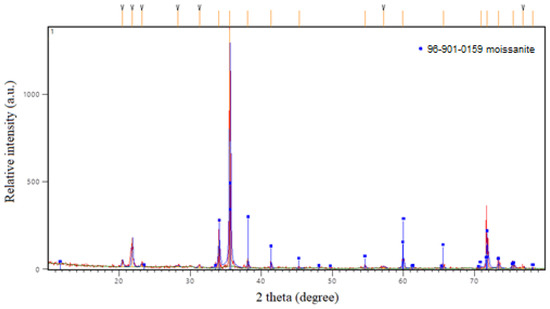 Figure 3 shows the diffraction pattern of the analyzed SiC nanopowder. It was established that high-intensity peaks in the X-ray diffraction pattern belong to moissanite (SiC).