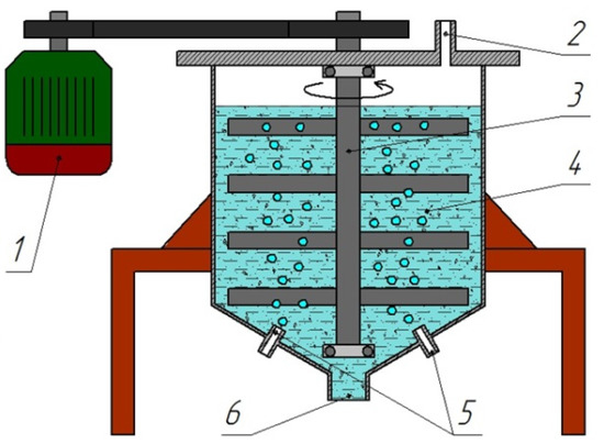 2 powders was evaluated by tinting the mixture with the pigment rhodamine. The time and mixing mode were experimentally selected until the suspension was uniformly colored in a liquid medium, using non-polar liquids (distilled and deionized water), in order to prevent coagulation of nanoparticles. Mixing of the charge components was carried out in an impeller-type reactor. The installation is a cylindrical, vertically located stainless steel container. A shaft with blades is installed on a rigid base. During the rotation of the shaft, the charge is mixed (