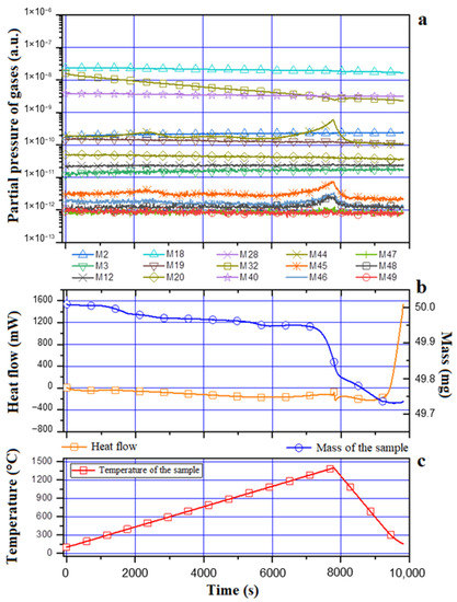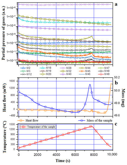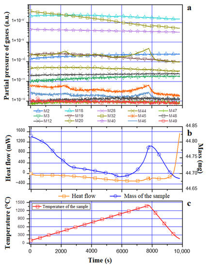 To study the processes of thermal decomposition and synthesis of various compounds, as well as to identify the temperatures of phase transitions, the method of thermogravimetric analysis was used with simultaneous recording of the heating curves of the studied samples (T), mass change (TG), mass change rate (DTG) based on a TGA/DSC 3+ thermogravimetric analyzer (Mettler Toledo, Greifensee, Switzerland) using ThermoStar mass spectrometric gas analyzer (Pfeiffer Vacuum, Vienna, Austria) and modular humidity generator MHG100 (ProUmid, Baden-Württemberg, Germany). The registration of the change in the mass of the sample during the experiment was carried out by built-in ultramicrobalance with a resolution of 0.1 μg and an accuracy of 0.005% in the entire weighing range. Changes in the composition of the gaseous medium in the volume above the test sample were carried out by a ThermoStar quadrupole mass spectrometer (Pfeiffer Vacuum, Vienna, Austria) with Quadera software. In order to reduce the stabilization time of the gas composition in the device chamber and to reduce the amount of atmospheric gases, the N2 purge rate was 50 mL/min. The maximum heating temperature was up to 1400 °C in order to avoid damage to the heater and thermocouple of the oven of the device. The error in determining the temperature is ±10 °C. Experiment conditions were as follows: sample heating temperature range from 100 to 1400 °C; linear heating rate of 10 °C/min; cooling rate of ~40 °C/min; nitrogen consumption in purge mode of 50 mL/min; and nitrogen consumption during the experiment of 50 mL/min.
