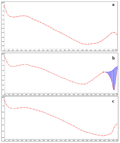 Figure 13b has a different form of the mass loss curve; at the maximum heating temperature of 1500 °C, the mass of the sample shows an increase by an average of 12% from samples S-1 and S-3 at the same temperature, while in sample S-2 is actively emitting carbon dioxide (CO
