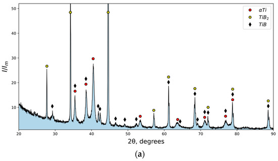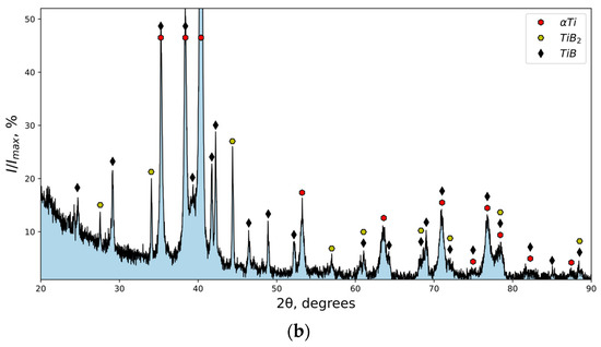 Figure 3a). In both cases, boron dissolves during interaction with the melt pool. According to literature data, boron reacts with the titanium alloy melt, leading to the formation of several titanium borides [