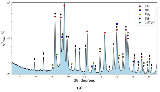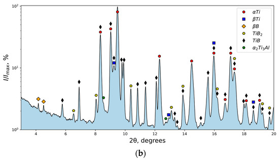 In contrast to the results obtained using X-ray diffraction on reflection, the use of synchrotron radiation allowed for the determination of βTi in both cases, and, for the sample with boron powder, an additional intermetallic phase α2 Ti3Al was synthesized.