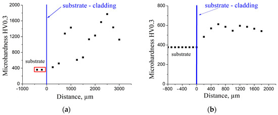 Figure 6b). There is a gradual increase in microhardness to an approximate value of 600 HV0.3 which then remains constant due to secondary phase formations in this area (