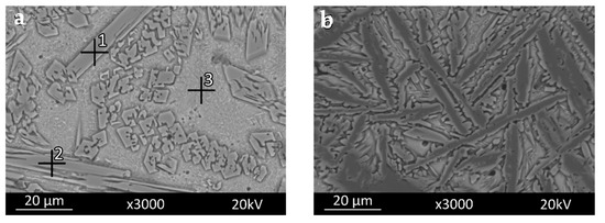 24], which improves the laser-absorbing ability of B–Ti powders. Increasing the boron content in the starting mixture allowed us to increase the absorption coefficient, thus increasing the absorbed energy and temperature in the melt baths and changing the enthalpy. There was strong mixing, which made it possible to actively carry out the reaction Ti + TiB2 → 2TiB, with the formation of mainly TiB. Apparently, TiB2 dissolved in liquid titanium. If the liquid had a sub-eutectic composition, titanium crystallized first, after which the eutectic crystallized. If the liquid was obtained hypo-eutectic, primary TiB crystallized first, after which the eutectic crystallized.