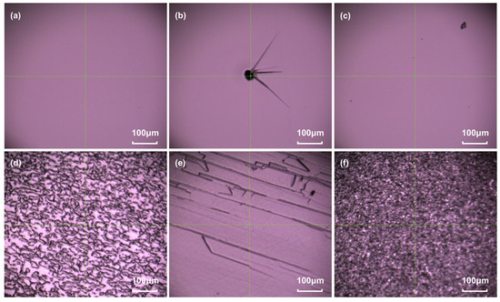 Figure 1a,d, the central and outer regions of sample 1 exhibit a uniform appearance, featuring a smooth and bright surface without noticeable defects. Similarly, in