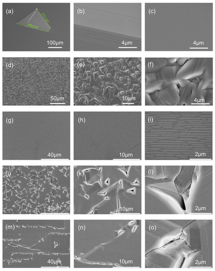 Figure 3g–i present SEM images of the central region of sample 2 at different magnifications. The surface exhibits a smooth and bright appearance under optical microscopy, but a noticeable accumulation of steps can be observed. In comparison to the surface morphology observed in