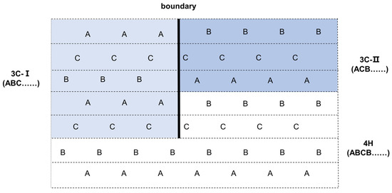 Figure 10 elucidates the mechanism behind the formation of double positioning boundary (DPB) defects during the epitaxial growth process in the 3C-SiC region. As the epitaxy proceeds on the substrate surface, the positions of the interfacial atomic layers between adjacent 3C-SiC and 4H-SiC regions exhibit variability. Notably, 3C-SiC exhibits two distinct stacking domains, namely ABC… and ACB…, and the growth of 3C-SiC selects specific stacking domains based on the initial atomic layer. At the interfaces between these two stacking domains, the occurrence of DPB defects is probable. Furthermore, when different DPB defects intersect, the formation of more pronounced tubular defects becomes possible.