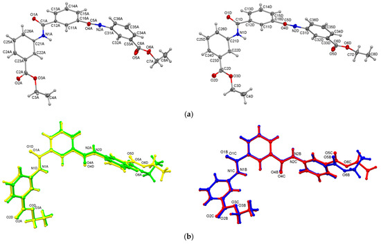 D3E crystallises as fine ‘candyfloss-like’ needles from ethyl acetate (Z′ = 4) [34,35], and the weakly diffracting crystals bend easily under pressure [36,37]. The D3E unit-cell data are metrically close to an orthorhombic setting with β = 90.447(3)°; however, a monoclinic setting is more appropriate, and a solution was readily obtained in space group P21 (No. 4) [22]. Related space groups were tried without success. A twin law of (−100, 0–10, 001) was applied during refinement to give a final R-factor of 0.077 (Table 1) [21]. D3E crystallises with four independent molecules (A, B, C, D) in the asymmetric unit, which differ slightly in conformation. The A–B and C–D molecules, as related pairs, are similar in conformation, with an overlay of ~0.1 Å (ESI). All four A–D molecules have the syn–anti molecular conformation and differ especially in the ester group orientation (Figure 2a). Therefore, the (C23⋯C26⋯C36⋯C33)A/B/C/D torsion angles and spanning of the molecules vary as 45.8(4)°, −50.6(4)°, −57.1(4)° and 59.8(4)° (for A, B, C and D, respectively), thus giving a range of ~14°. Differences can also be noted from the overlays of the A–D and B–C pairs to highlight the subtle conformational differences (Figure 2b), an example being the four C6 C11/C21 ring interplanar angles, which are 47.5(3)°, 43.3(3)°, 43.8(3)° and 40.4(3)° (a range of ~7°). The C4ABCD…C8ABCD terminal CH3 distances vary as 13.765(17)–13.839(16) Å and 14.325(19)–14.230(17) Å, respectively, highlighting that molecules A and D are the most dissimilar in geometric terms.