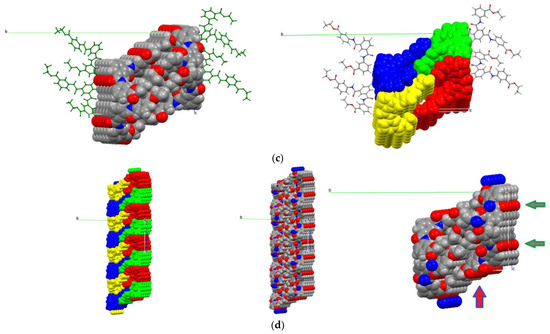 D4E adopts an asymmetrical anti–anti conformation (Figure 3a) and is distinctly different to the more symmetrical D2E molecular structure (Figure 1). The intermolecular interactions in D4E (with ring⋯ring stacking dominant) combine regular amide⋯amide interactions together with C-H⋯O/π(arene)/π(C=O) contacts. Both amide⋯amide interactions (per D4E molecule) form 1D chains, with N1⋯O1iv = 2.993(4) Å aligning along the b-axis direction (Figure 3b), and N2⋯O4v = 2.899(4) Å along the c-axis direction (Figure 3c). The amide⋯amide interactions in combination form molecular sheets (walls) that are one molecule or half of the unit-cell a dimension (½ × a) and ~22.6 Å wide, together with numerous additional interactions. The terminal ester groups and, effectively, their ethyl groups (at either end of the D4E molecules) line the 2D sheet (wall) surface. This sheet surface (interface) is essentially hydrophobic in nature, with two sheets bisecting every unit-cell a length parallel to (100) (Figure 3d).