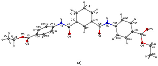In summary, the general areas for which both types of DxE and PxE derivatives are common have seen considerable research in helical structures using the PxE type as a basis, and also for potential exploratory applications as MOFs [5,7]. The CSD contains several related structures, from the original paper by Malone and co-workers [40] through to the acid derivative structures in research by Pombeiro et al. [10,12]. More recently, Caltagirone and co-workers have shown the utility of the related halogen derivatives in sensing studies [41], and in related research, our work moved from benzamides to isophthalamides and detailed interactions in a series of isophthalamides [19]. While the diacid derivatives as, for example, ether diacids (e.g., [42]) can have potential in binding and coordination chemistry (as for EDTA), the diesters are, in and of themselves, the basis for compounds using reactivity at the amide group for the conversion into the mixed amide–imide or dimide systems [3,4], and for the subsequent conversion of the ester groups to acids. This represents, in and of itself, a future development in three–four reaction steps of the accessibility of a whole new range of organic ligands with potential in the chemistry and materials research areas, and with increasing levels of molecular complexity [43,44].