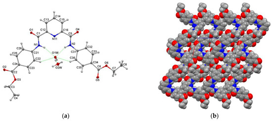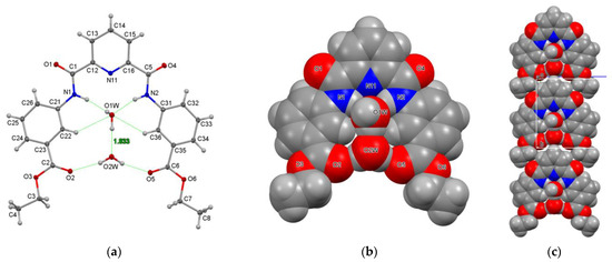 The amido N1/N2 atoms form strong N(C)-H⋯O1W hydrogen bonds, with O1W displaced from the 34-atom P3E molecular plane. O1W forms a strong O1W-H1W⋯O2W hydrogen bond, which then forms two hydrogen-bonding interactions within the molecular niche with the two C=O ester group atoms as O5⋯O2W⋯O2. A total of seven out of eight strong hydrogen bonds are contained within the [P3E·2H2O] aggregate. The remaining O1W-H2W donor forms a cyclic hydrogen bond with a symmetry-related P3E molecule as O1W-H2W⋯O1xii, generating a hydrogen-bonded dimer. Apart from this cyclic interaction and tight hydrate binding, the other notable structural feature in P3E·2H2O is the arrowhead chain formation (Figure 5c). The P3E molecule forms O2W⋯H14-C14iv interactions with symmetry-related molecules in the b-axis direction, forming 1D chains (Figure 5c). The intermolecular interactions also involve ring⋯ring-stacking contacts from partial molecular overlap, together with several weak C-H⋯arene interactions. The 1D arrangement is interesting. The P3E molecule is a useful ligand in coordination chemistry and binding studies, and for coordination to metal complexes as mono- and binuclear systems, and especially via the ester functionalities [9,10,11,12].