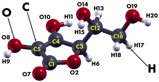 The structure of the L-ascorbic acid (C6H8O6) as considered in this work. It consists of 20 atoms, 6 carbon atoms, 6 oxygen atoms, and 8 hydrogen atoms. The atoms are labeled to identify bond lengths and angles, following the setup used in [14]. This configuration corresponds to the final structure obtained by using the PBE + vdW functional.