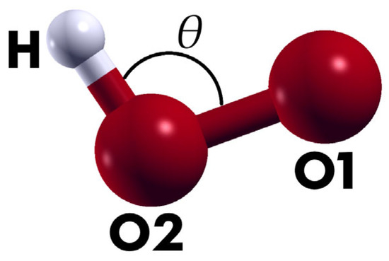 Structure considered in this work for the hydroperoxyl radical HO2 or HOO. The experimental bond length between the H atom and the O atom (labeled O2–H) is 0.96 Å, while the bond length between O atoms is equal to 1.3 Å. The angle θ is experimentally equal to 108° (see [54]). The labels correspond to the length and angle identification of Table 3. The figure shows the optimized structure obtained by using the PBE + vdW functional, as in Figure 1.
