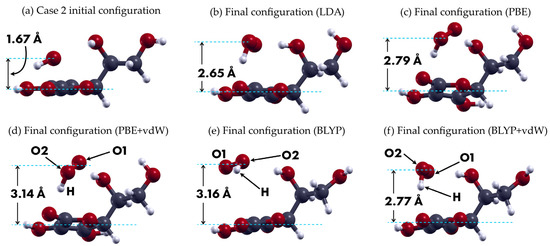 Structural relaxations for the second case considered in this work, corresponding to the H-atom of the radical pointing downward. (a) Initial position: the O-atoms axis is placed parallel to the C6H8O6 pentagon plane. The rest of the images in this figure are shown from this same point of view and present the final configurations obtained with (b) the LDA, (c) PBE, (d) PBE + vdW, (e) BLYP, and (f) BLYP + vdW density functional approximations. In both cases, the qualitative behavior is similar to those of case 1.
