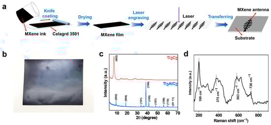 (a) The preparation process diagram of the MXene array antenna. (b) Digital photograph of MXene film. (c) XRD patterns of Ti3C2 flakes and Ti3AlC2 MAX phase. (d) Raman spectrum of MXene film.