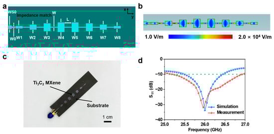 Figure 3a shows the structure photograph of the serially fed MXene linear array antenna. A microstrip line feeds each patch in series along the y-axis direction. The input feeding port links with a section of 50 Ω microstrip line. For the purpose of matching the characteristic impedance between the feeding port and the adjacent patch [32], a quarter wavelength impedance converter is added, which can be seen from the red elliptical coils in Figure 3a. To ensure all patches have identical excitation phases, the distance between adjacent patches is approximately half of the equivalent wavelength of the operating frequency in the dielectric substrate with the feeding line impedance of 100 Ω. The structure of MXene array antenna is constructed and simulated in CST Studio. Figure 3b depicts the electric field distributions of LAA at 26 GHz. The maximum electric field amplitude is in two center patches of the LAA (W4, W5) and decreases sequentially along the two patches towards the sides, which conforms to Chebyshev distribution. To optimize antenna performance by dimensioning rectangular patches and microstrip transmission lines. The variables of the proposed MXene LAA after parametric optimizing are provided in Table 1. Figure 3c shows the digital photograph of MXene LAA produced by the method of laser engraving. VNA (Vector network analyzer, PNA-X N5247A of Agilent Technologies) is utilized to test the performance of MXene LAA, which coaxial connector selects 2.92 mm. Figure 3d describes the simulation and measurement of reflection coefficient results of MXene linear array antenna, the simulated resonant frequency is at 26 GHz and the simulated reflection coefficient is −35 dB. Compared with the simulation, the measured resonant frequency has a little frequency deviation. Human error in the production process causes the results. The bandwidth of the measured −10 dB impedance is 25.21–26.92 GHz with 188.8% of the simulation result.