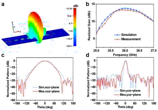 To further research the radiation performance of LAA, the radiation properties of LAA were measured in a microwave anechoic chamber and compared to simulated data. Figure 4a depicts the three-dimensional (3D) radiation pattern of MXene LAA, the maximum radiation direction along the positive z-axis. The simulation and measurement of realized gain, normalized radiation patterns of LAA in the xoz-plane and yoz-plane are shown in Figure 4b–d. The peak realized gain in the bandwidth range of 25–27 GHz is 13.34 dBi which has a difference of 0.45 dBi compared with the simulation. The maximum difference in the direction of the main lobe between the simulated and measured is 3° approximately. The measured normalized radiation pattern values trend is similar to the simulation. The sidelobes levels (SLL) of yoz-plane is lower than −20 dB, which fulfills the design requirement. Compared to the xoz-plane radiation pattern, the half-power beam width of radiation pattern in yoz-plane is 12.4° which is a narrow beam, indicating the MXene LAA has a high angular resolution of detection in the yoz-plane. The results indicate MXene LAA has excellent performance at 25–26 GHz, which can be available for high gain array design.