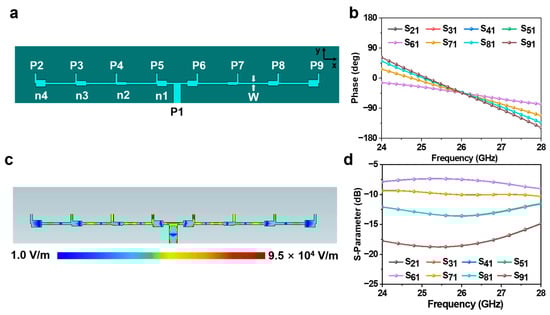 Meanwhile, varying the widths of each quarter wavelength impedance converter to modify the characteristic impedance can control the power distribution between each output port. Table 1 demonstrates the optimized parameters. Figure 5b shows that each radiation port has the same phase at 26 GHz. The electric field distributions of the feeding network demonstrated in Figure 5c show that the electric field amplitude decays from the center to both sides, which conform to the design requirement. As well as the power of each radiation port is distributed to satisfy the Chebyshev distribution, which can be seen in Figure 5d.